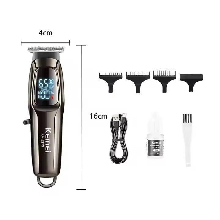 The KEMEI KM-2273 is a professional wireless hair cutting machine featuring a powerful motor, stainless steel blades, LED display, and long-lasting 1800mAh lithium battery for home and professional use.