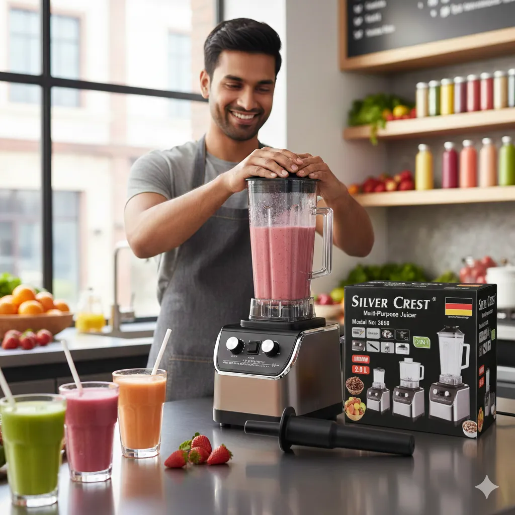 The Silver Crest 3-in-1 Juicer Blender Grinder is a powerful 1000W multipurpose kitchen machine designed for juicing, blending, and grinding—all in one compact, durable unit.